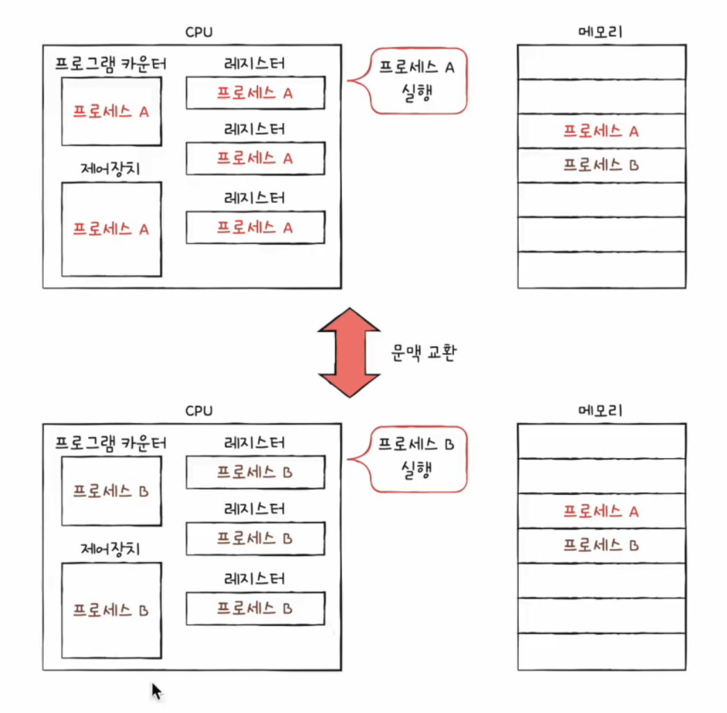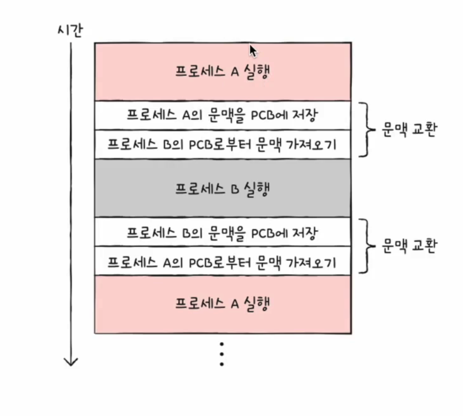 위에서 문맥에는 사용했던 레지스터 정보도 포함된다고 했는데, 이러한 레지스터 값을 프로세스 A의 PCB에 저장하고, 다시 프로세스 B의 문맥을 복구하면 자연스럽게 프로세스의 실행이 재개될 수 있습니다.