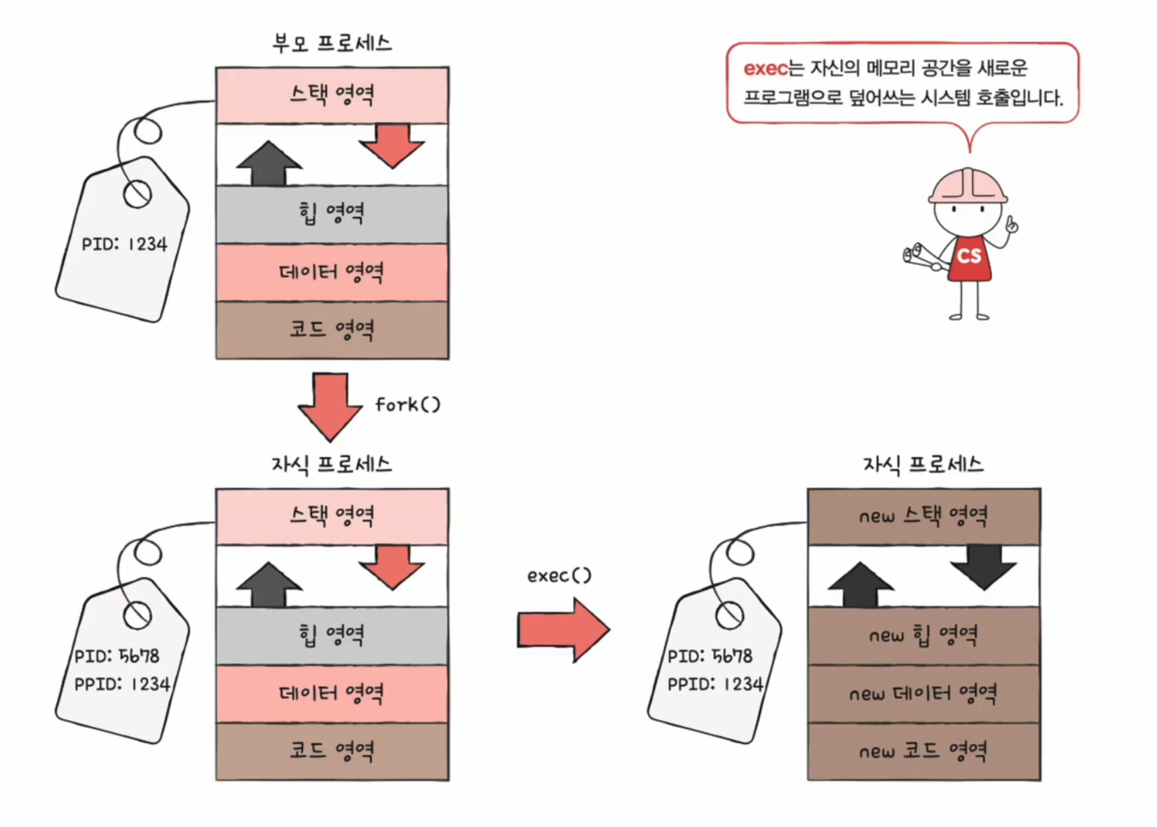 여기서 이제 자식 프로세스가 exce라고 하는 시스템 호출을 하면, 메모리 공간을 새로운 프로그램으로 덮어쓰기 합니다. 코드와 데이터 영역은 실행할 프로그램 내용으로 바뀌고, 나머지 영역은 초기화됩니다.