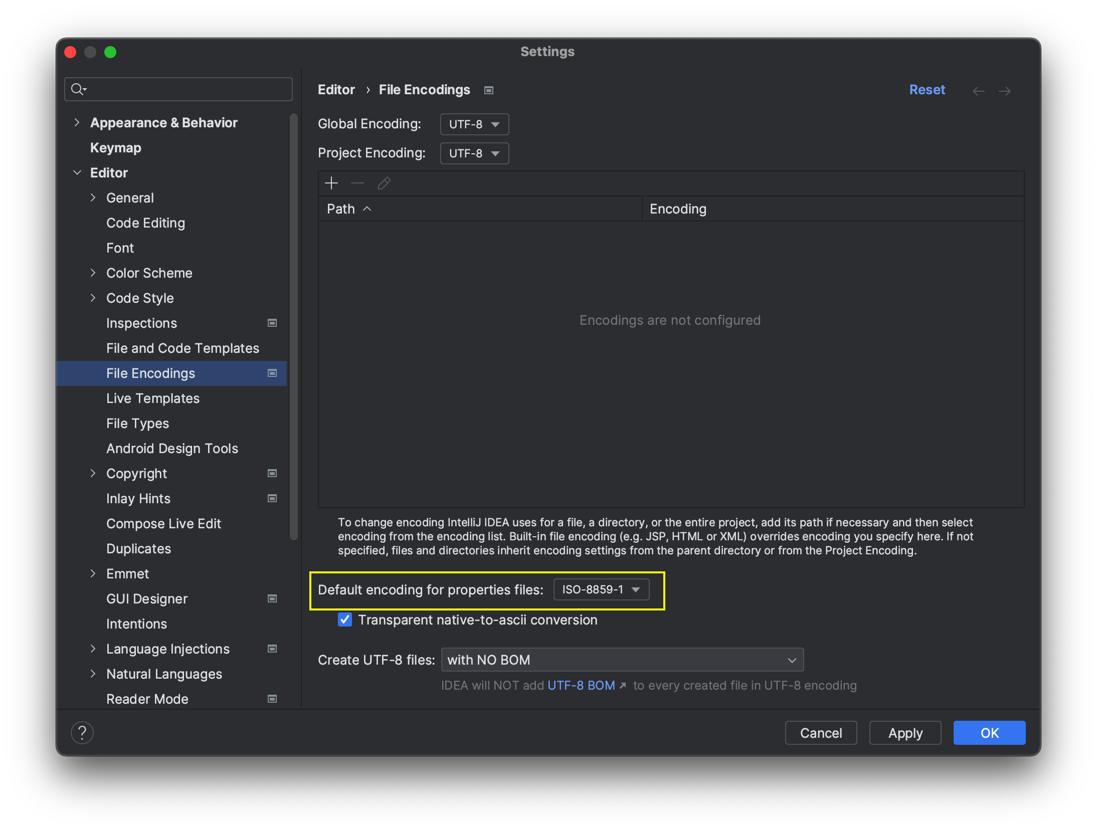 Default encoding for properties files 를 이때 바로 UTF-8 로 바꿔주도록 합시다
