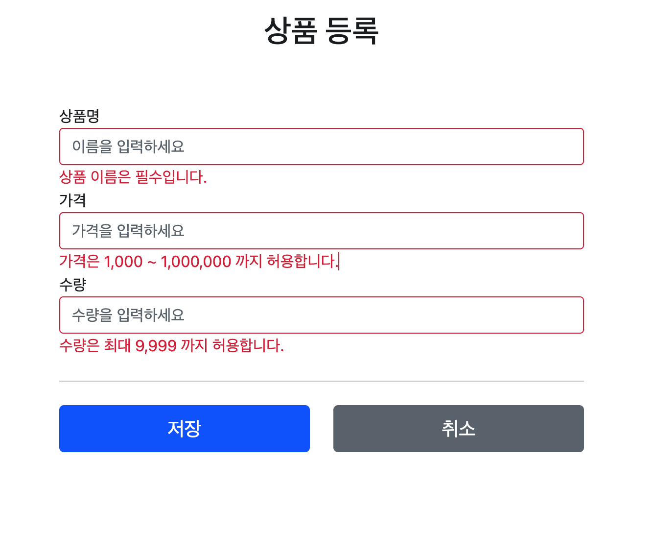 성공 로직 (상품을 정상 등록)과 더불어 검증 로직, 검증에 실패하면 다시 입력 폼으로 돌아가는 로직을 구현합니다